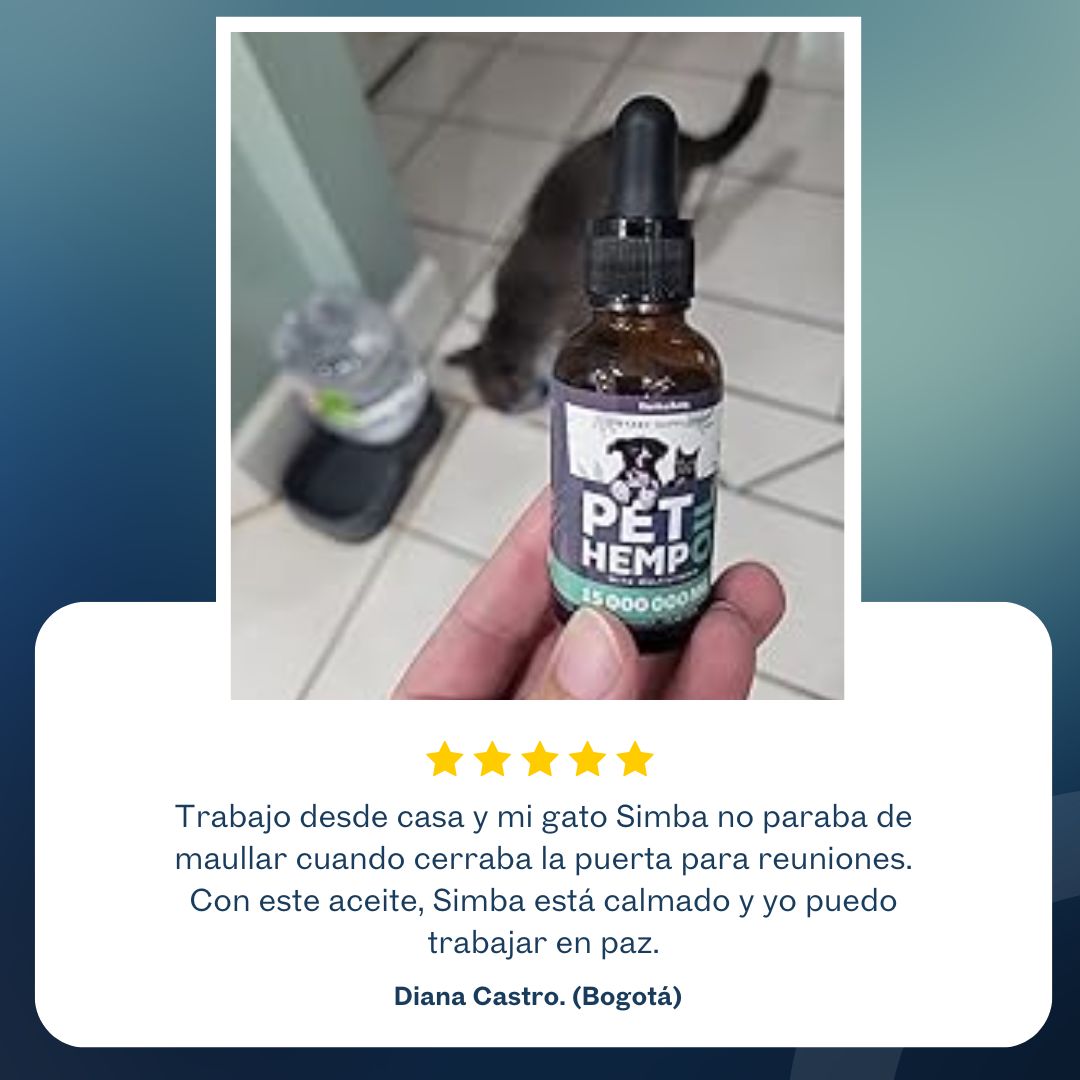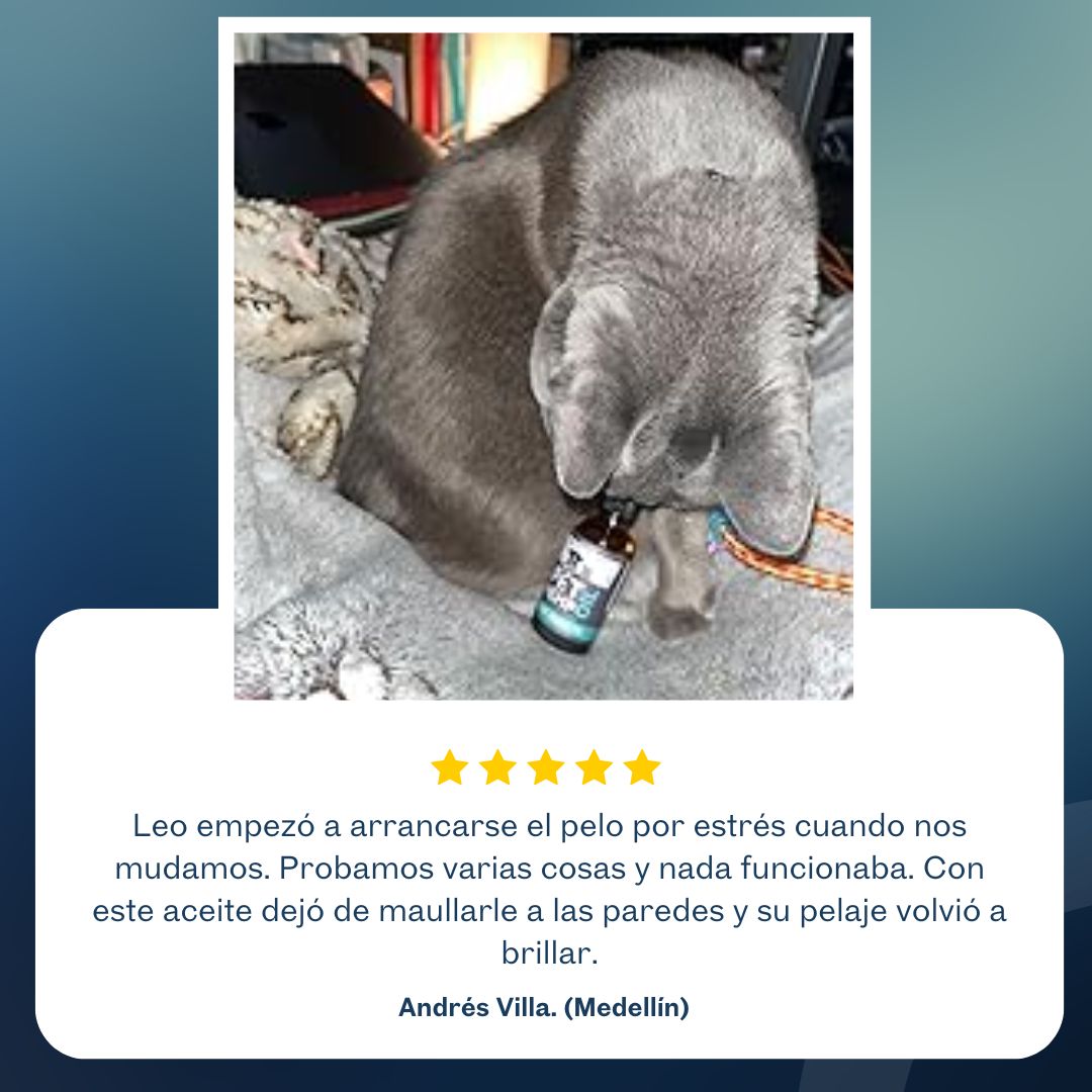 El aceite está hecho con ingredientes naturales que relajan a tu peludo de forma segura. No es sedante, solo ayuda a equilibrar su sistema nervioso y reducir la tensión.
